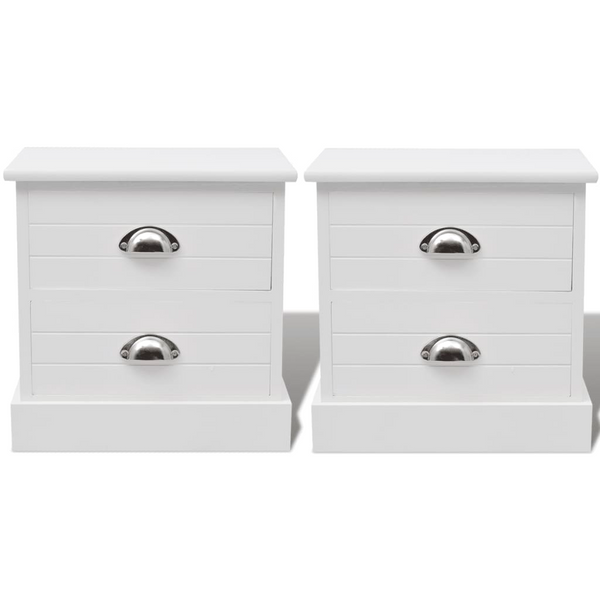 These classic bedside cabinets in a French country house style will add a touch of rustic charm to your bedroom, living space or lounge room. They can also be used as telephone stands, side cabinets, small cabinets, drawer cabinets, storage cabinets, nightstands, night cabinets, bedroom cabinets, end tables, end cabinets, etc. These compact cabinets each have 2 smoothly running drawers, which provide ample space for keeping smaller items organised and within reach. Made of high-quality materials, the cabinets are very durable. Delivery includes 2 bedside cabinets.