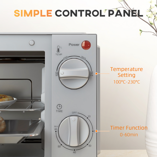 Whatever the space or size, it's easy to cook a wide variety of food with this HOMCOM countertop oven. Comes with a removable wire rack and cooking tray, with two different holding levels to reposition easily. The heat range, between 100°C and 230°C, means you can cook at different temps - no unneeded burnt food! The 0-60 minutes timer means it will switch off when you need it to, without being in the same room. A stylish and sleek design, making food hot and tasty anywhere you like.